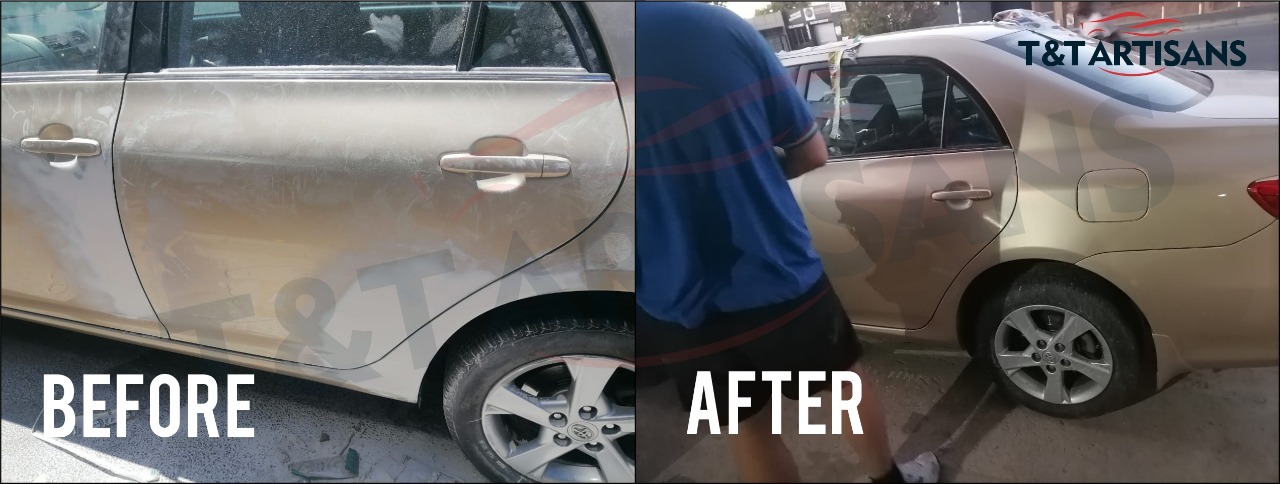 A process that involves stripping off dust and rust to prepare a vehicle for painting. Painting to a vehicle is done with a spray gun.